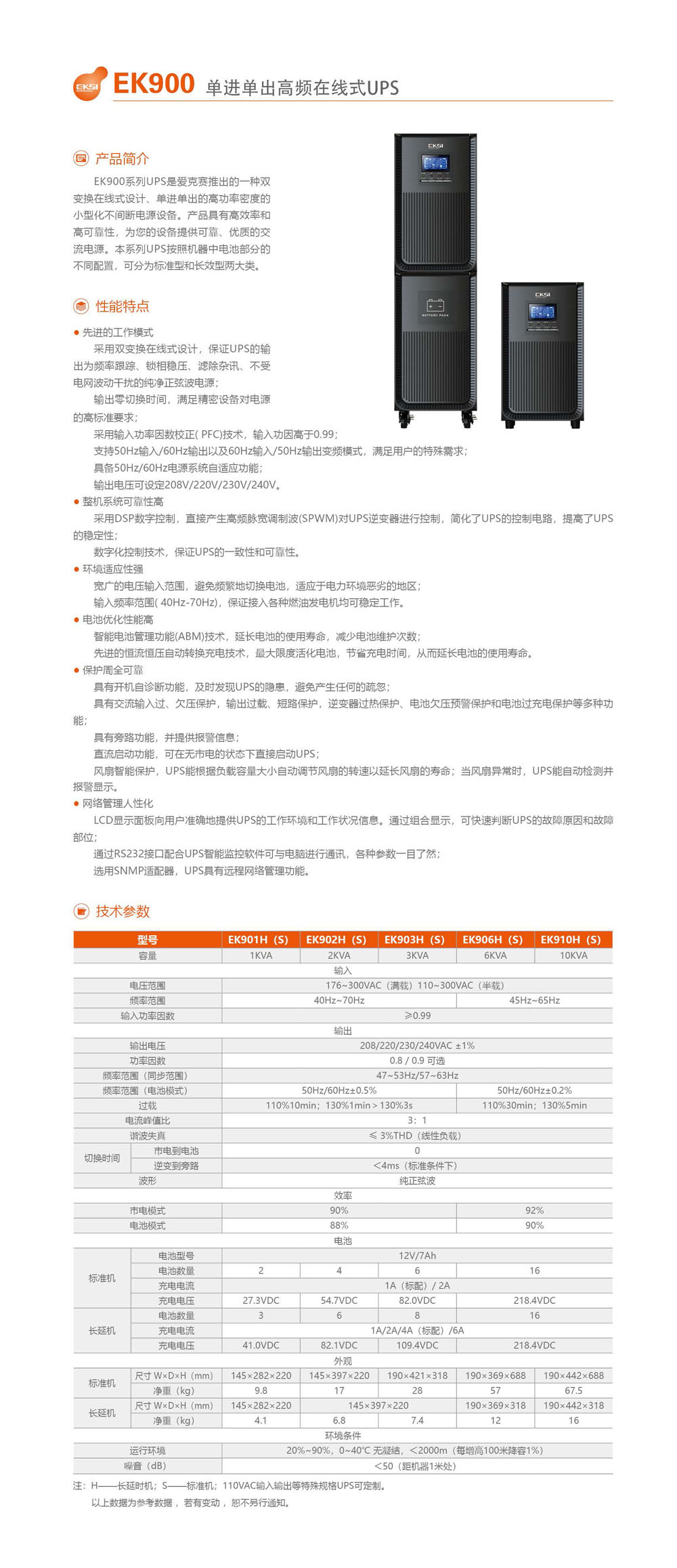 EK900RT系列采用雙轉(zhuǎn)換純在線式架構(gòu)設計,單進單出的塔式不間斷電源設備。能有效解決電源問題,對電網(wǎng)出現(xiàn)的斷電、電壓過高或過低,浪涌電壓、諧波失真、雜波干擾等狀況都可以提供良好的解決 。