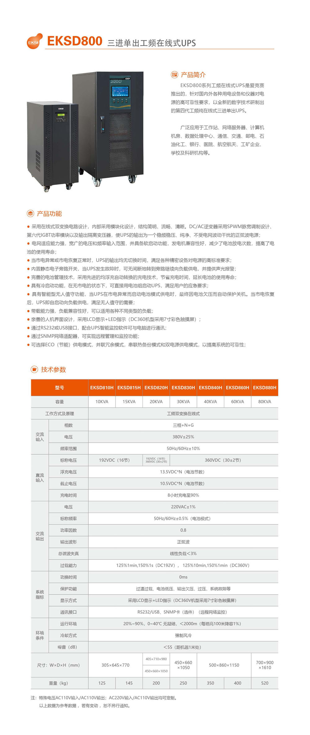 愛克賽EKSD800系列塔式三進(jìn)單出工業(yè)級(jí)工頻在線式UPS電源采用在線式雙變換電路設(shè)計(jì),DC/AC逆變器采用SPWM脈寬調(diào)制技術(shù)、IGBT功率模塊以及輸出隔離變壓器,使UPS的輸出為一外穩(wěn)頻穩(wěn)壓、純凈、不受電網(wǎng)波動(dòng)干擾的正弦波電源。